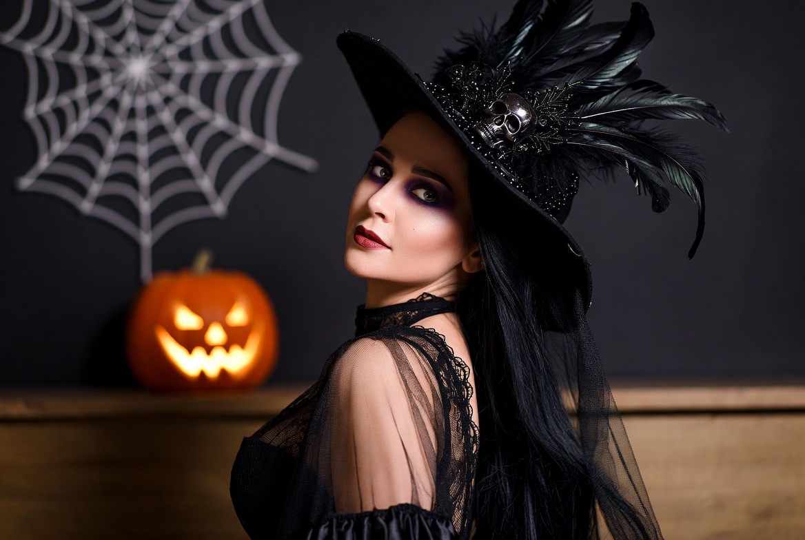 A woman with long black hair and dramatic purple makeup wears a large black witch hat adorned with skull and feathers. She dons a sheer black lace dress and gazes sideways against a dark background featuring a large spider web and glowing carved pumpkin. The Halloween-themed setup highlights her mysterious profile.