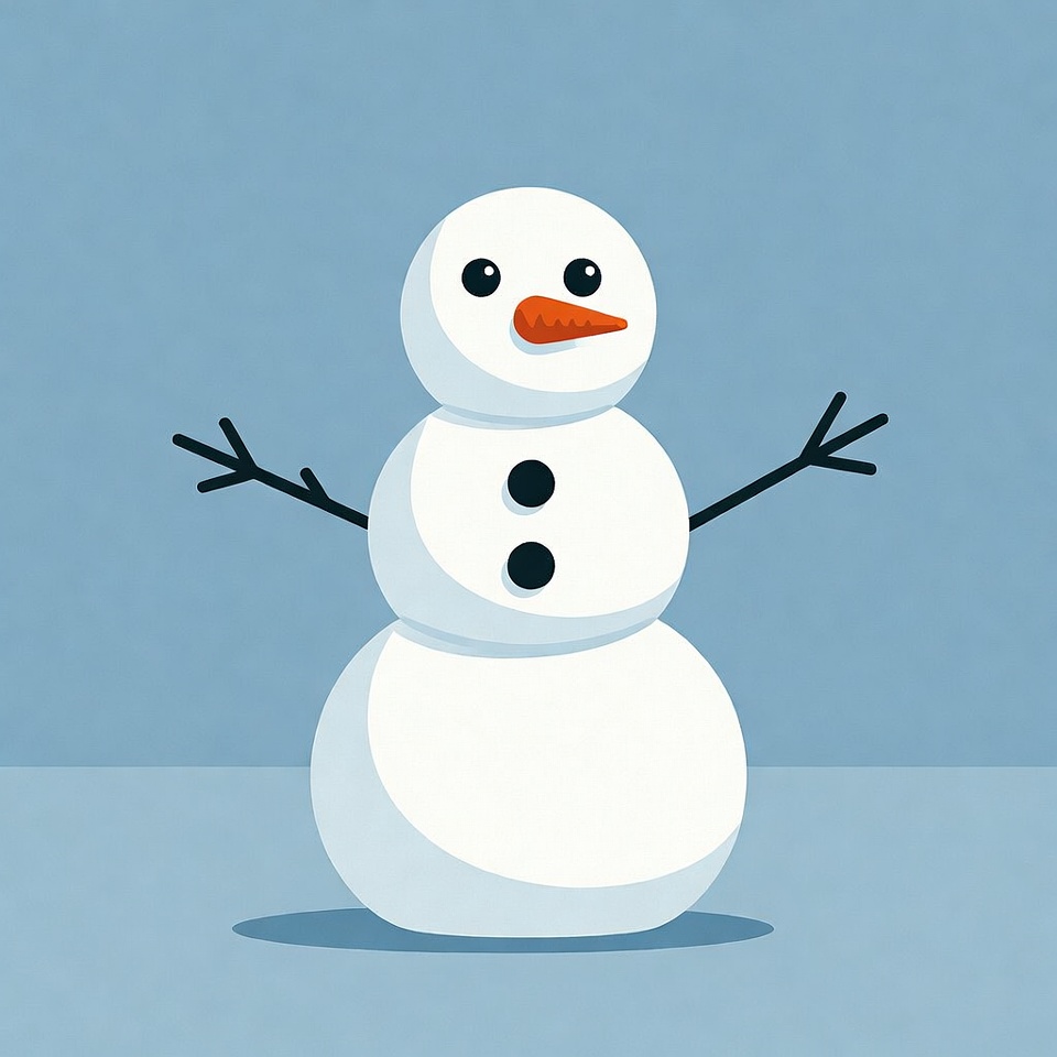 A simple illustration of a three-ball snowman stands on a light blue background. It has a carrot nose, black dot eyes and buttons, and thin black twig arms outstretched. The snowman appears friendly and cartoonish.