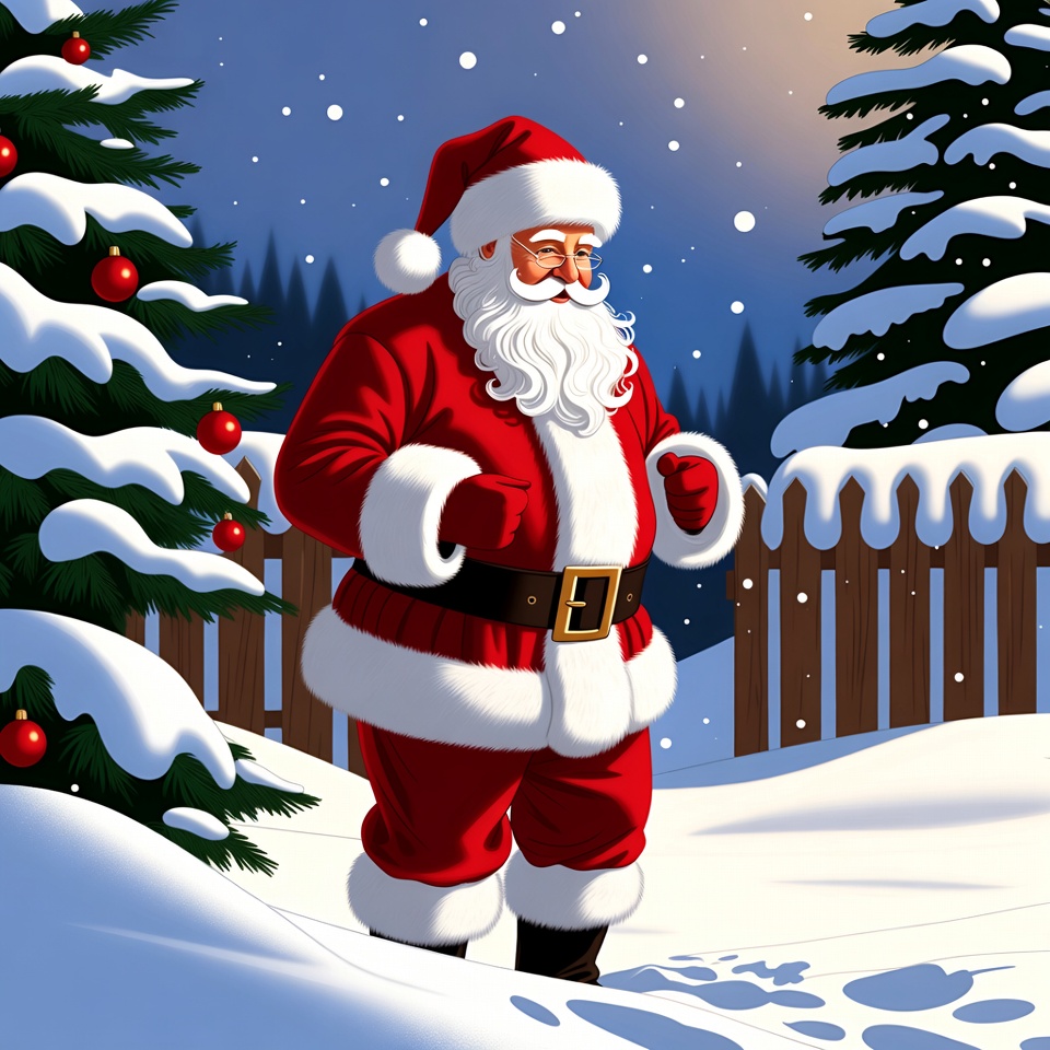 An illustration of Santa Claus in a red suit with white trim walks through a snowy forest at night. He has a long white beard, wears a red hat, and carries a black belt with a large buckle. Snow-covered pine trees, Christmas ornaments, and a wooden fence surround him under a starry sky.