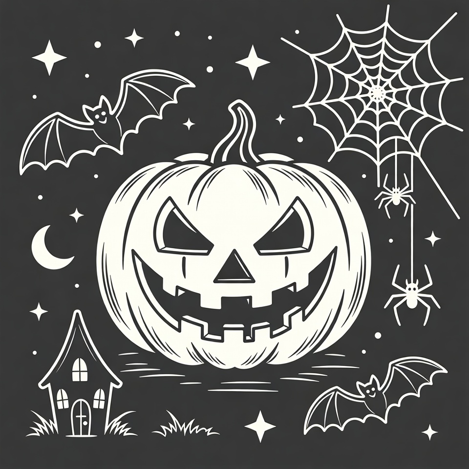 A large carved pumpkin with menacing eyes and a grinning mouth sits prominently in a black Halloween illustration. Surrounding elements include flying bats, spider webs, spiders, a crescent moon, stars, and a small haunted house on grass. The entire scene is rendered in white line art on a solid black background.