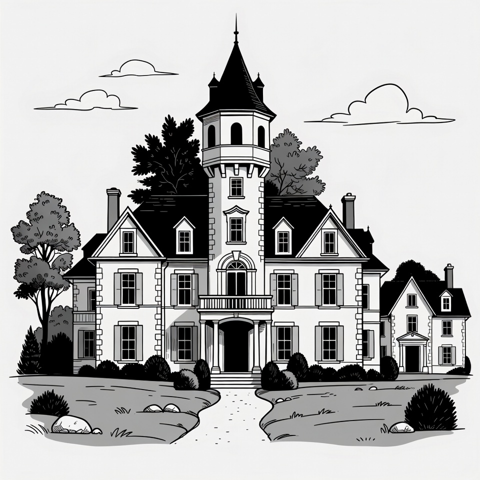 A detailed black and white line drawing depicts a large Gothic-style mansion with a tall central tower and steep roof. Flanking wings and smaller adjacent buildings feature shuttered windows and arched doorways. Tall trees, shrubs, clouds, and a winding path surround the house on a grassy lawn.