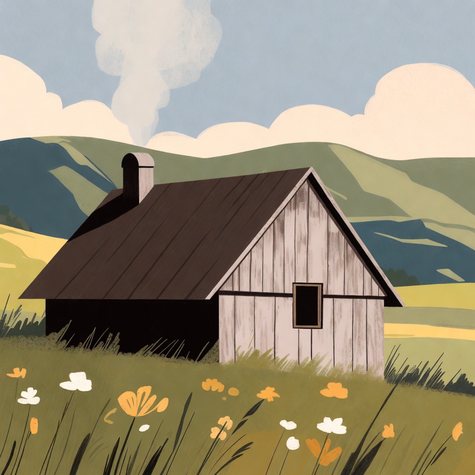 A small wooden cabin with a sloped roof and chimney emitting smoke sits in a vibrant meadow filled with white and orange flowers. Lush green hills and mountains rise in the background under a partly cloudy sky. The scene is rendered in a colorful illustration style with layered, painterly details.