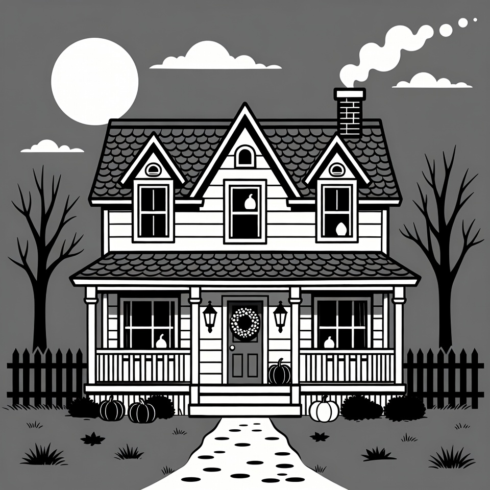 A black and white illustration depicts a classic haunted house with a steep roof, chimney smoke, and glowing windows under a full moon. Bare trees frame the house, which features a front porch with lanterns, a wreath on the door, and pumpkins on the ground. A picket fence and stone path lead to the entrance amid sparse grass.