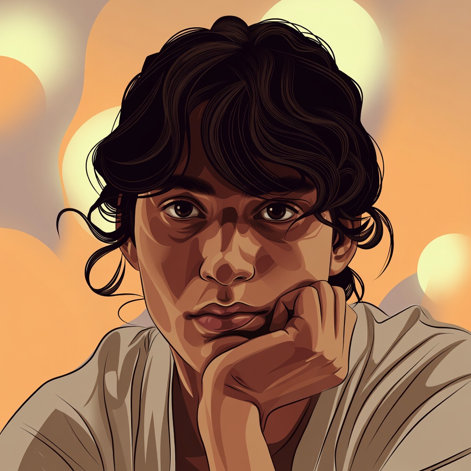 Digital illustration of a young man with curly black hair and warm brown skin, resting his chin on his hand. He gazes thoughtfully with dark eyes against a glowing orange background with yellow bokeh lights. He wears a light-colored shirt in this close-up portrait.