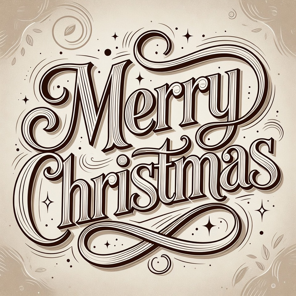 Christmas, Christmas text, artistic, beige background, brown ink, calligraphy, celebration, clipart, decorative, elegant, festive, greeting card, hand drawn, holiday greeting, holiday illustration, illustration, leaves, line art, ornate, script text, seasonal, stars, swirls, typography, vector art, vintage, Merry Christmas