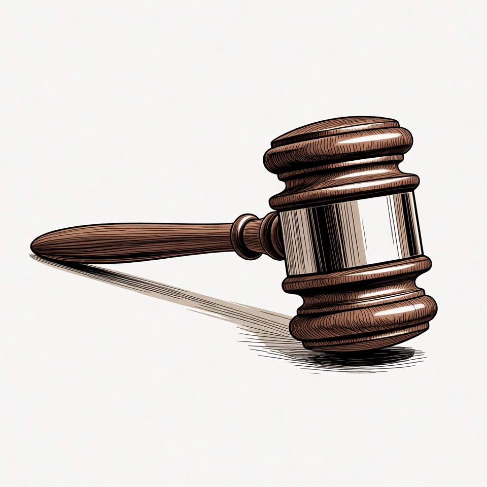 A detailed illustration of a wooden gavel with a brown handle and silver head rests on a white background. The gavel features realistic wood grain texture and a subtle shadow beneath it. It is depicted in a classic style suitable for legal or judicial imagery.