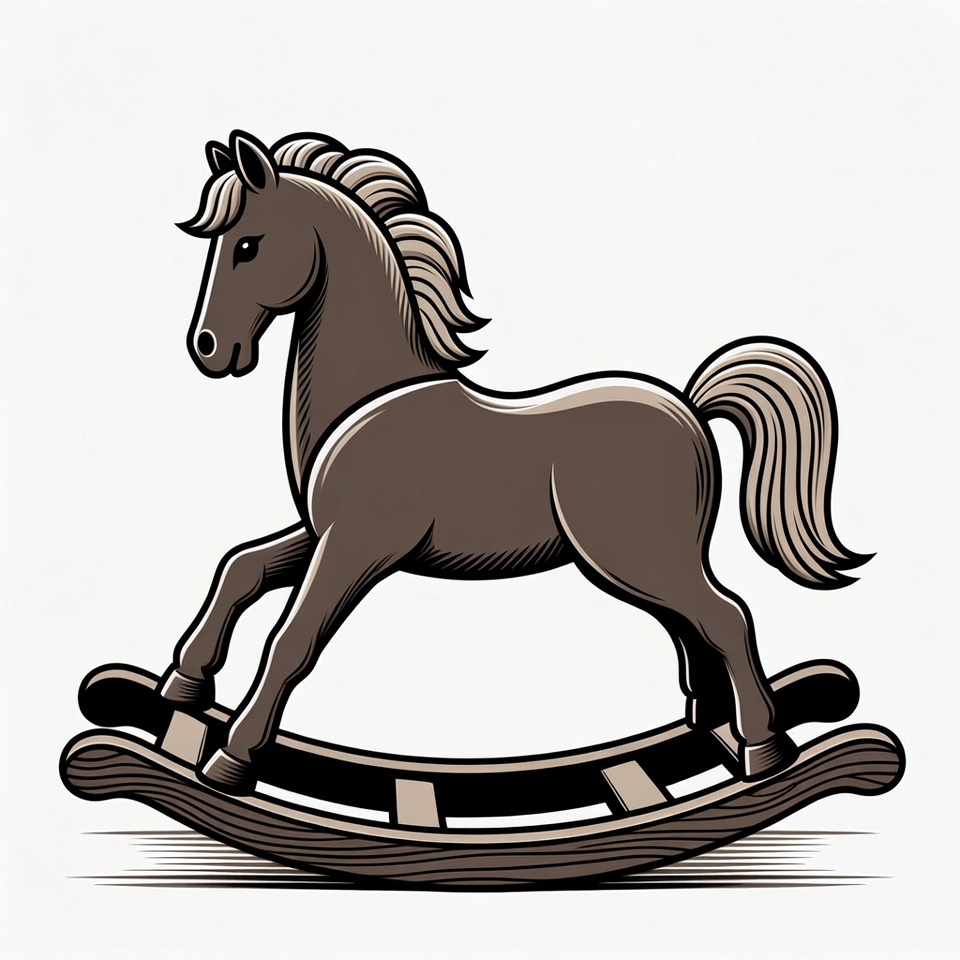 animal illustration, brown horse, clipart, curved rockers, engraving, flowing mane, horse, illustration, isolated background, line art, toy, vintage toy, wooden horse, rocking horse