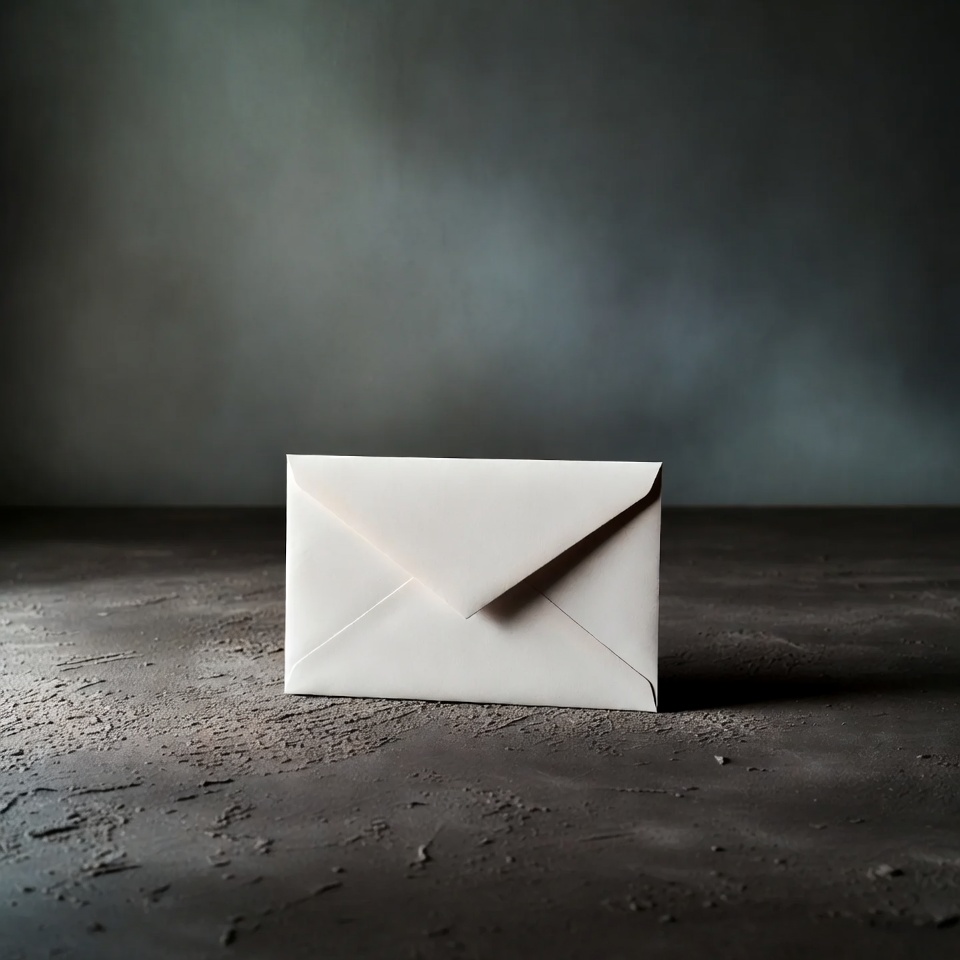 blank envelope, correspondence, dark background, dim lighting, gray surface, isolated, letter, mail, paper, sealed envelope, smoke effect, textured floor, top view, white envelope, envelope