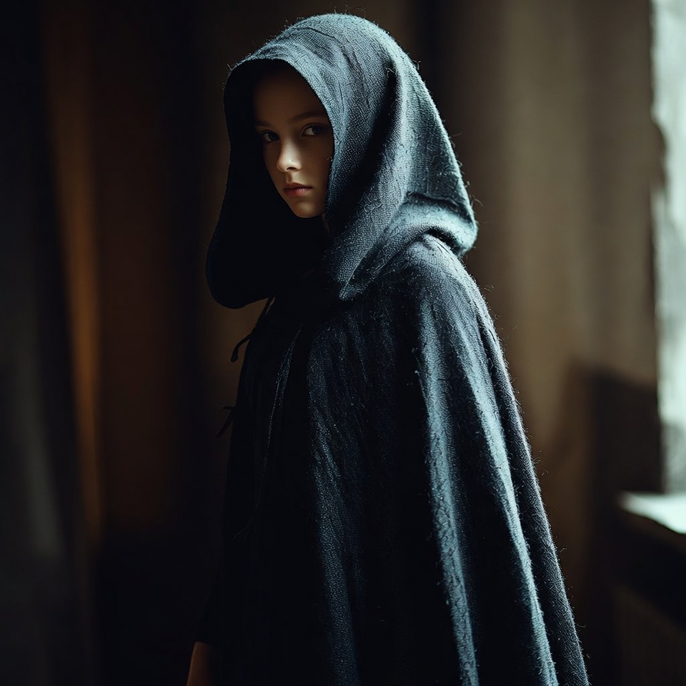 A young girl with pale skin and dark hair stands in a dimly lit room wearing a dark hooded cloak. Her hood is pulled up, partially shadowing her face as she gazes forward with a serious expression. Soft light filters through a window behind her, illuminating the folds of her cloak.