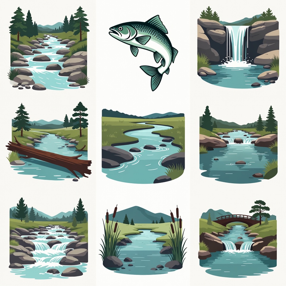 A collection of nine flat vector illustrations depicts various river and nature scenes. Elements include flowing streams, waterfalls, salmon fish, pine trees, mountains, reeds, logs, and a wooden bridge. All icons feature a clean, minimalist style with teal water and green landscapes on isolated white backgrounds.