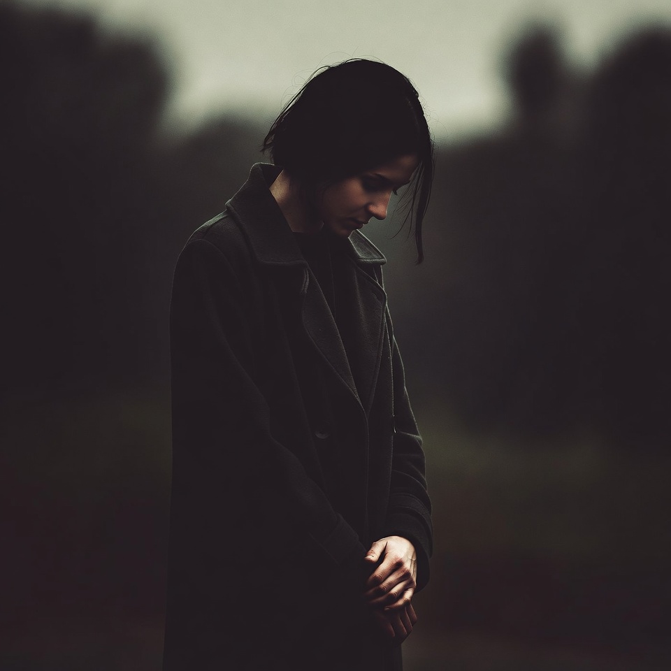 atmospheric, black coat, black hair, dark clothing, female, foggy background, hands clasped, long coat, looking down, mist, outdoor, portrait, short hair, side profile, standing, trees, young woman, woman