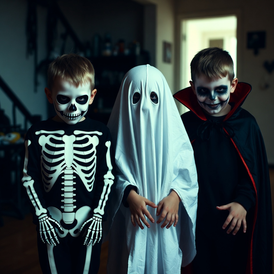 Three young boys stand together in Halloween costumes inside a dimly lit home. One wears a white skeleton jumpsuit with face paint, another a white ghost sheet, and the third a black cape with vampire face paint. They pose playfully with hands visible in a cozy indoor setting with stairs and decorations.