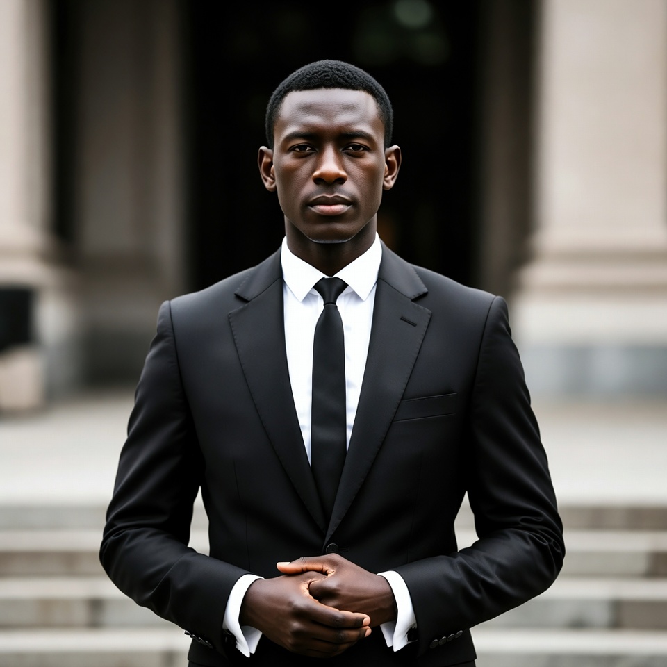 A young African-American man stands confidently on stone steps in front of a grand building entrance. He wears a tailored black suit with a white dress shirt and black tie, hands clasped in front. His short hair and serious expression complete the professional look.