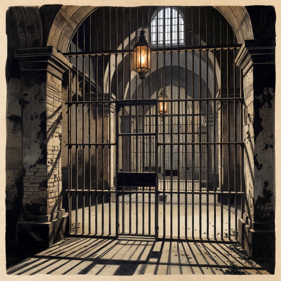 arched corridor, barred window, brick walls, dungeon entrance, gothic architecture, heavy gate, illustration, iron bars, isolated background, jail cell, lantern light, open gate, shadows, stone arch, vintage style, prison gate