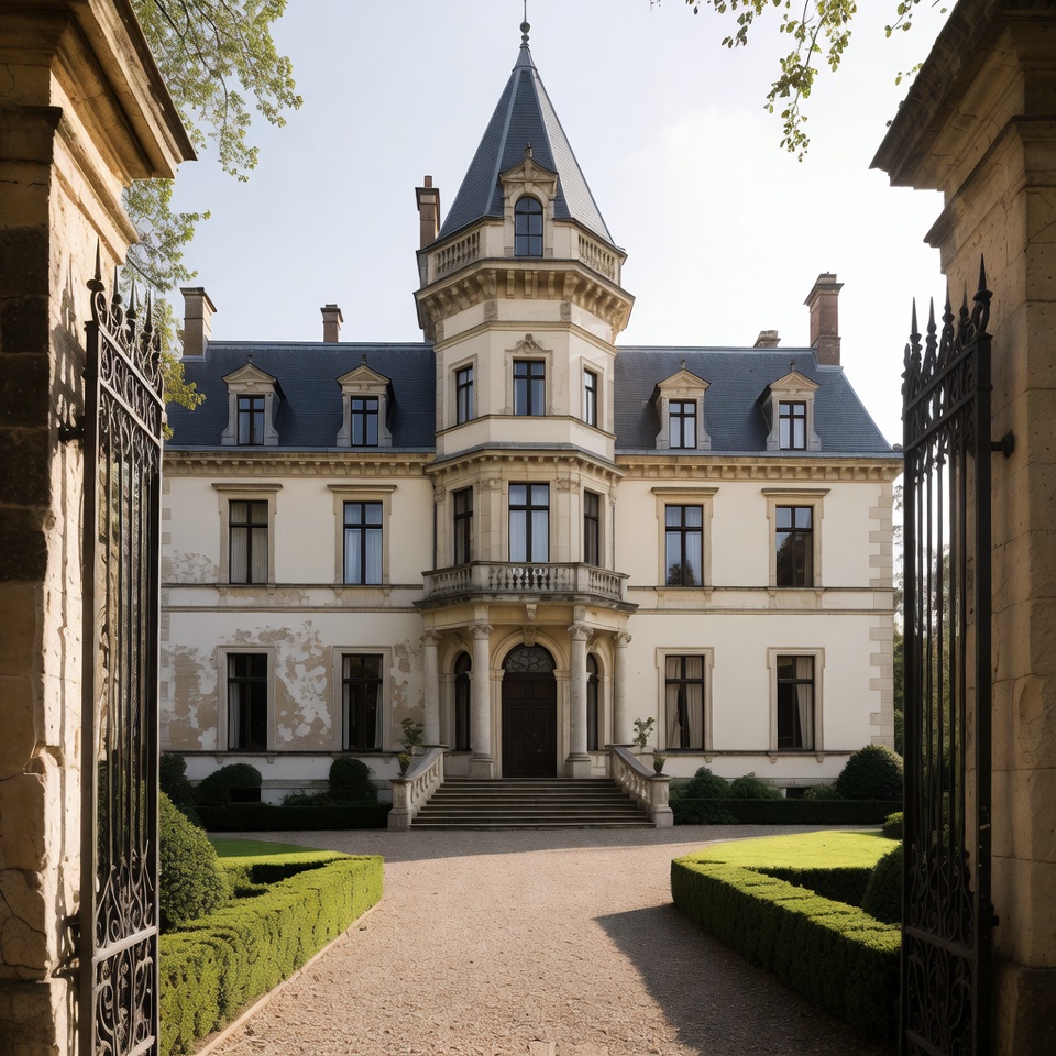 European architecture, French, architecture, balcony, castle, columns, driveway, entrance, estate, facade, gates, grand house, gravel path, hedges, historic building, luxury home, manor, mansion, slate roof, steeple, stone pillars, sunlight, tower, trees, windows, wrought iron, chateau