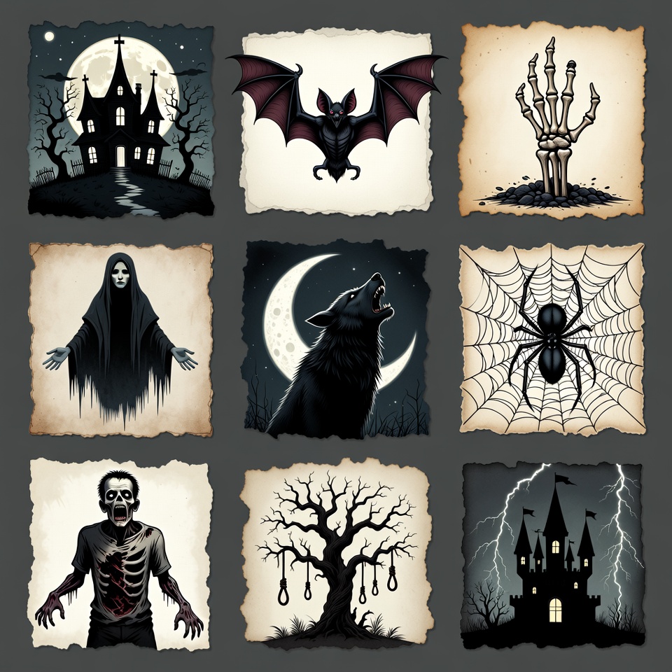 Halloween icons, barren tree, bat, black wolf, bony hand, clipart, collage, dark castle, dead tree, female, flying bat, full moon, ghost woman, giant spider, gothic, haunted castle, horror, howling wolf, isolated background, lightning castle, noose, shrouded ghost, skeleton hand, spider web, spooky, stormy castle, undead zombie, vintage illustration, zombie, Halloween