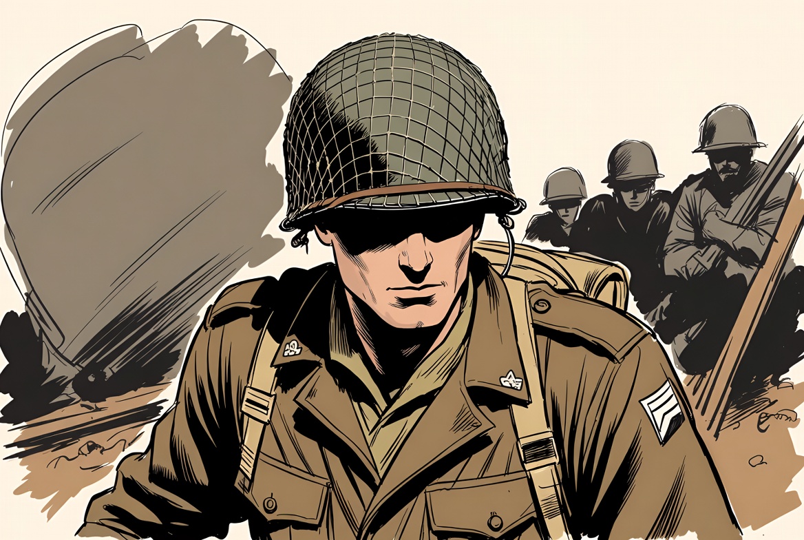 A detailed illustration of a stern-faced soldier wearing a helmet and WWII uniform stands in the foreground. Several fellow soldiers in similar gear and helmets are positioned behind him, holding rifles. The artwork features bold lines and a beige background with abstract shapes.