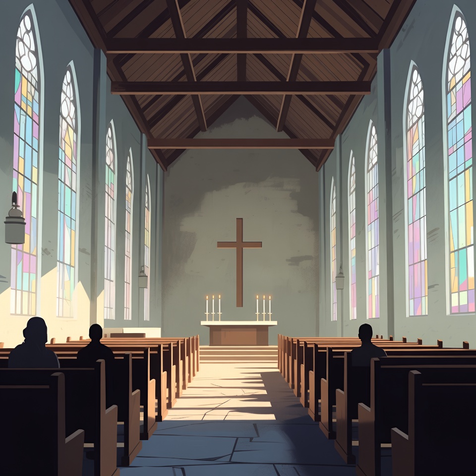 Anime Church Interior with Silhouetted Worshippers