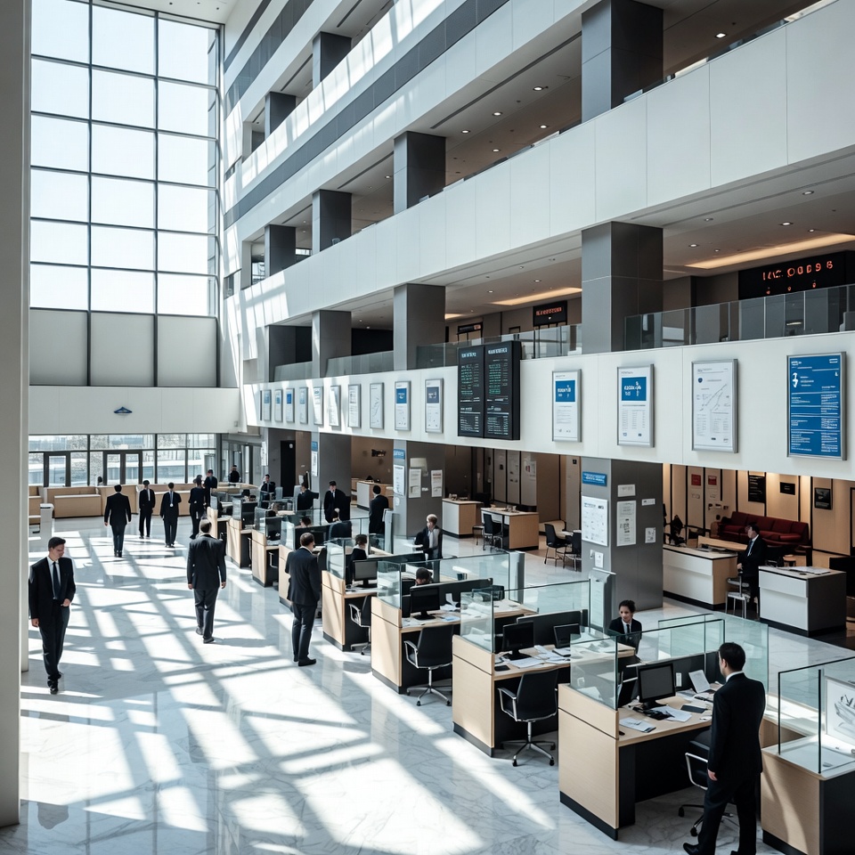 A spacious modern bank atrium features multiple levels with glass walls and digital displays. Numerous Asian men in black suits work at counters and desks on the ground floor. Sunlight streams through large windows, illuminating the marble floors and contemporary architecture.