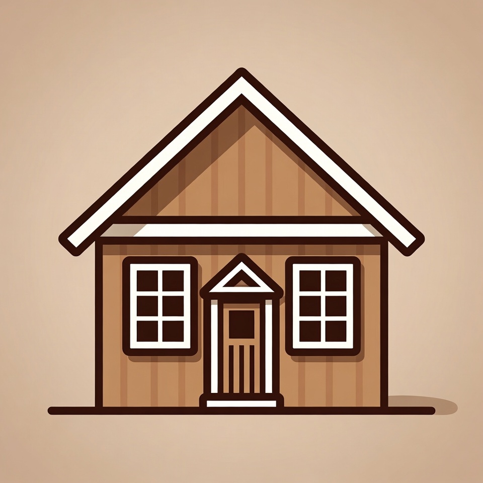 A simple line art illustration of a cozy wooden house with vertical plank siding and a gabled roof. The house features two square windows with white frames and a centered front door under a small triangular porch. It stands on a beige background with subtle shadows.