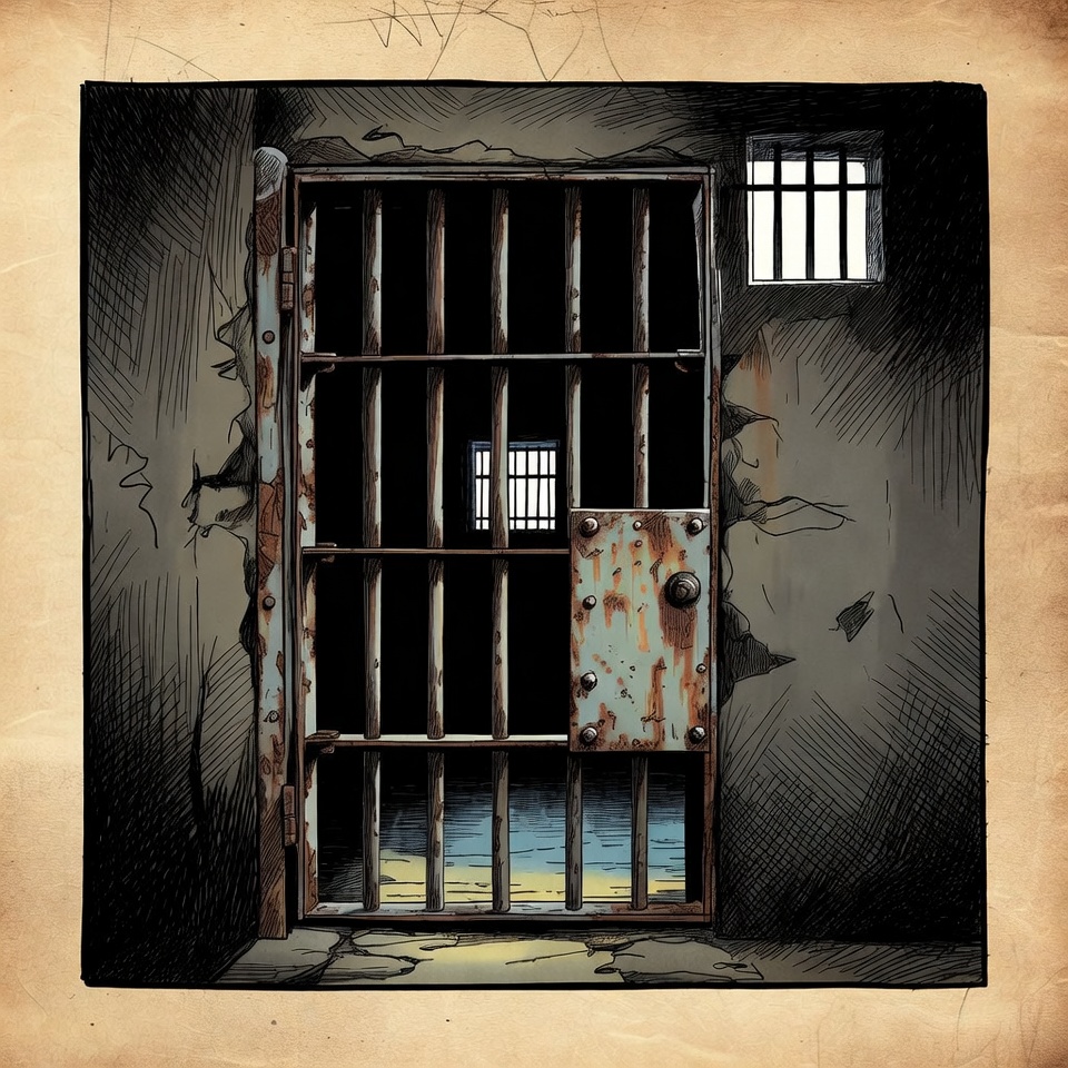 A hand-drawn illustration depicts a rusty iron prison cell door with thick bars and a small barred window. The door stands open in a dimly lit stone cell with peeling walls and a sandy floor. Through the bars, a glimpse of ocean waves is visible in the distance.