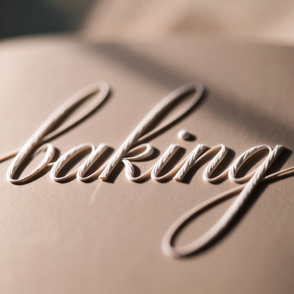 baking word, beige background, calligraphy, close-up, cursive font, elegant typography, embossed, graphic design, isolated background, lettering, scripted, text, white letters, word, baking