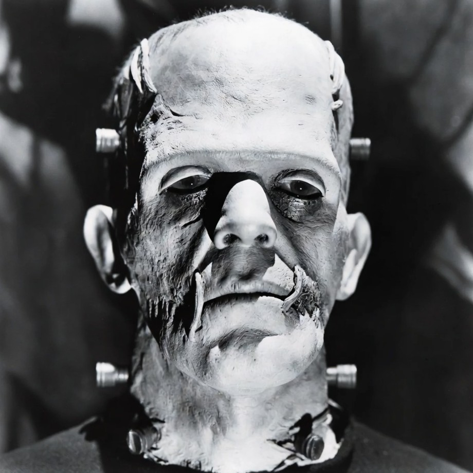 A black and white close-up portrait of the Frankenstein monster with a flat-top head, neck bolts, and scarred green-tinted skin. His face features sunken eyes, prominent brow, and a grim expression. The image is dramatically lit against a dark background.
