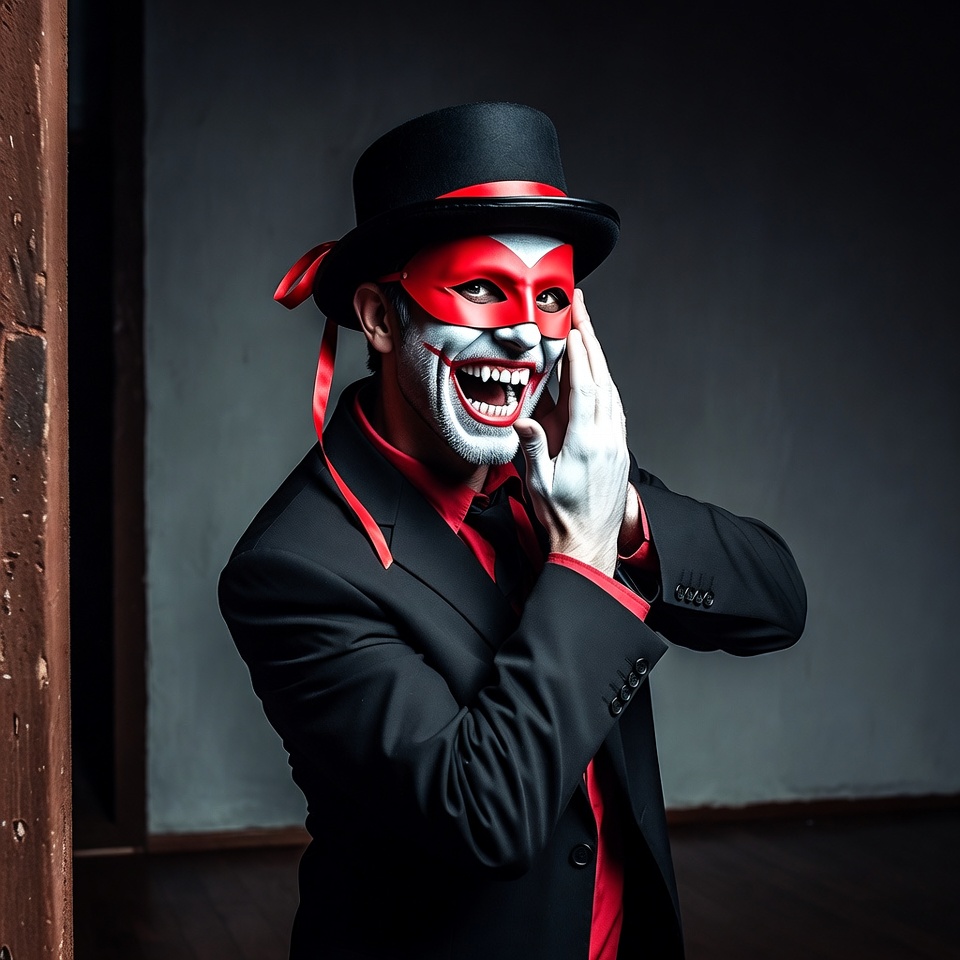 black suit, bow tie, circus, costume, dark room, dramatic pose, fangs, hand mouth, hat, isolated background, jacket, makeup, male, man, mime, performer, red mask, red shirt, top hat, white makeup, wooden door, clown