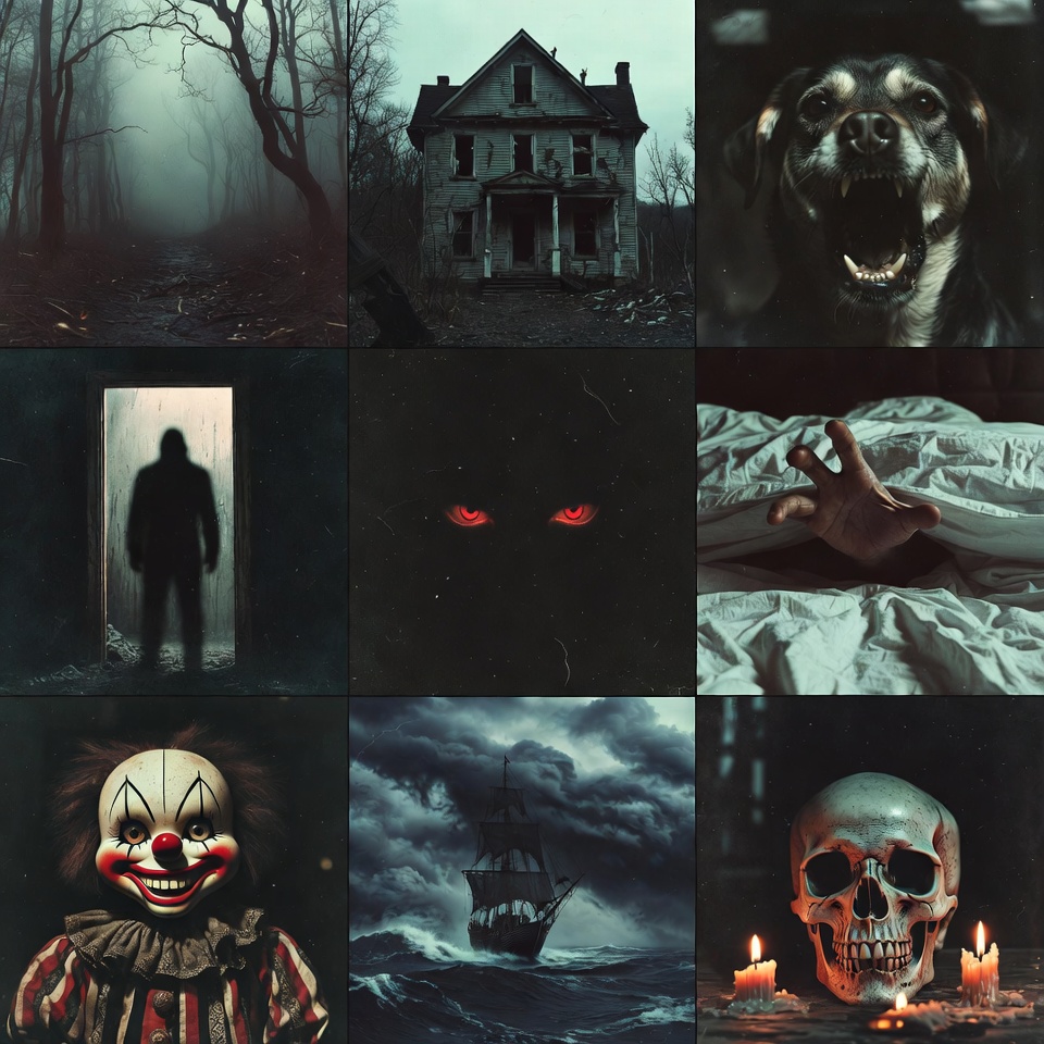 Halloween, abandoned house, bedsheets, black dog, candles, clown doll, collage grid, creepy hand, dark atmosphere, evil clown, fog, foggy forest, haunted house, horror art, human skull, mist, red eyes, sailing ship, scary images, shadowy figure, silhouette, snarling dog, spooky, stormy sea, trees, horror collage