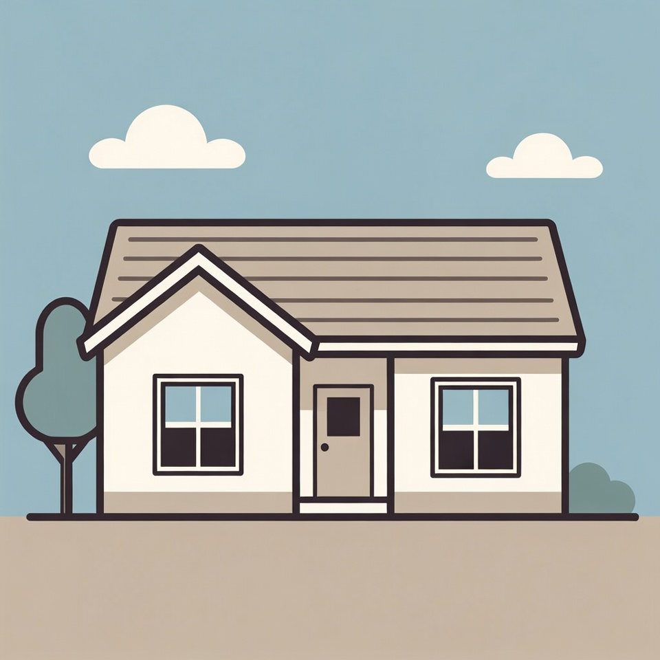 A minimalist line art illustration depicts a white single-story house with a sloped roof, two windows, and a front door. A green tree stands to the left, with small bushes nearby, all set against a light blue sky with fluffy white clouds. The house features clean outlines and a flat ground base.