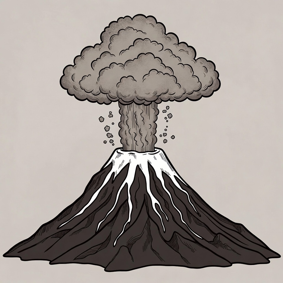 A detailed black and white line drawing depicts a volcano in full eruption. A massive gray mushroom-shaped ash cloud billows from the snow-capped peak. Debris particles scatter around the thick central plume rising from the dark rocky slopes.