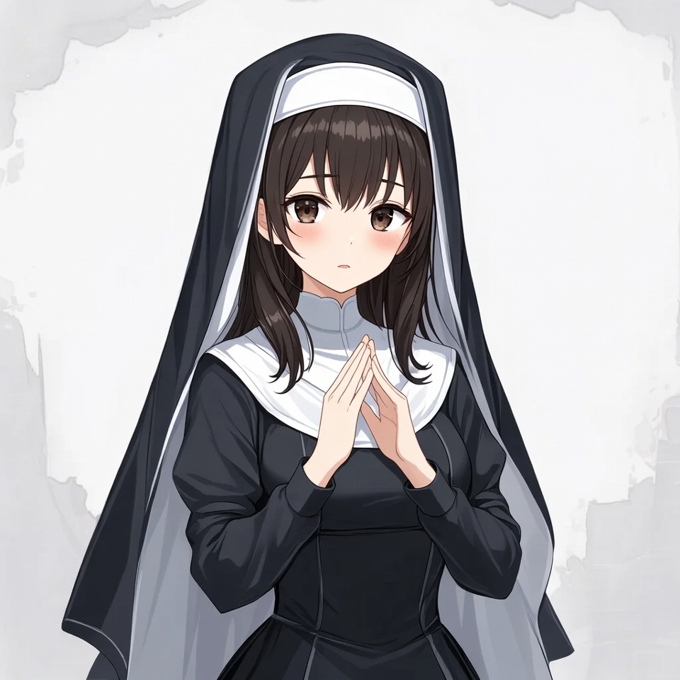 An anime-style illustration of a young woman dressed as a nun with a black habit and white coif. She has brown hair, large expressive eyes, and is clasping her hands together in a praying gesture. The image features a soft gradient background with a translucent overlay.
