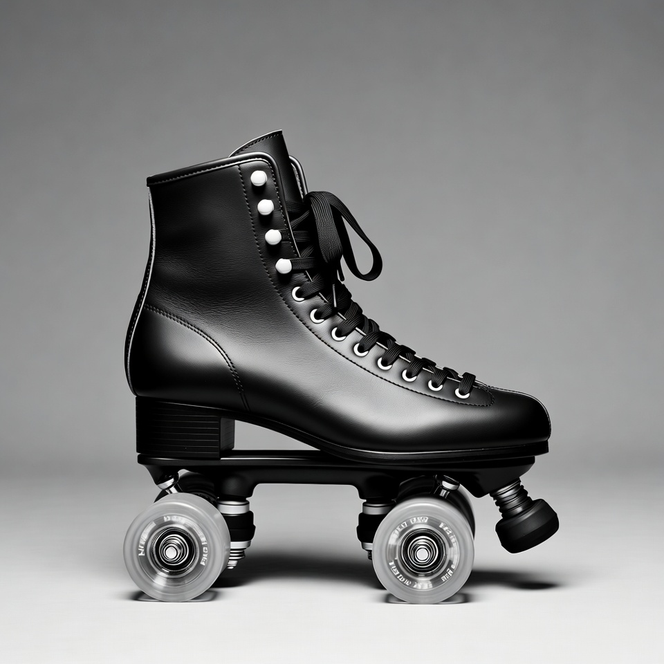 black leather, black skates, footwear, high-top skates, isolated background, laced skates, leather skates, quad skates, rollerblades, skating gear, skating shoes, sports equipment, transparent wheels, vintage skates, white wheels, roller skates