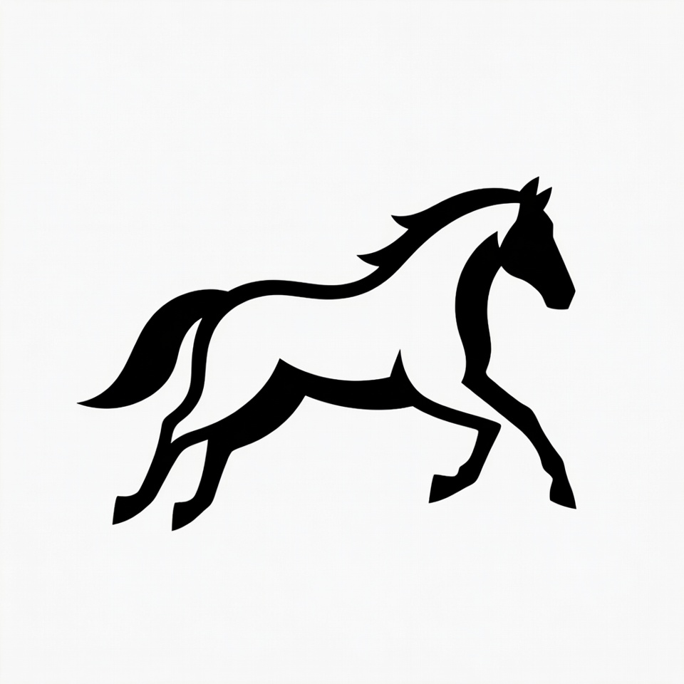 A black and white silhouette illustration of a horse galloping with its mane and tail flowing. The horse is depicted in profile view on a transparent background. The design features bold outlines and smooth curves.