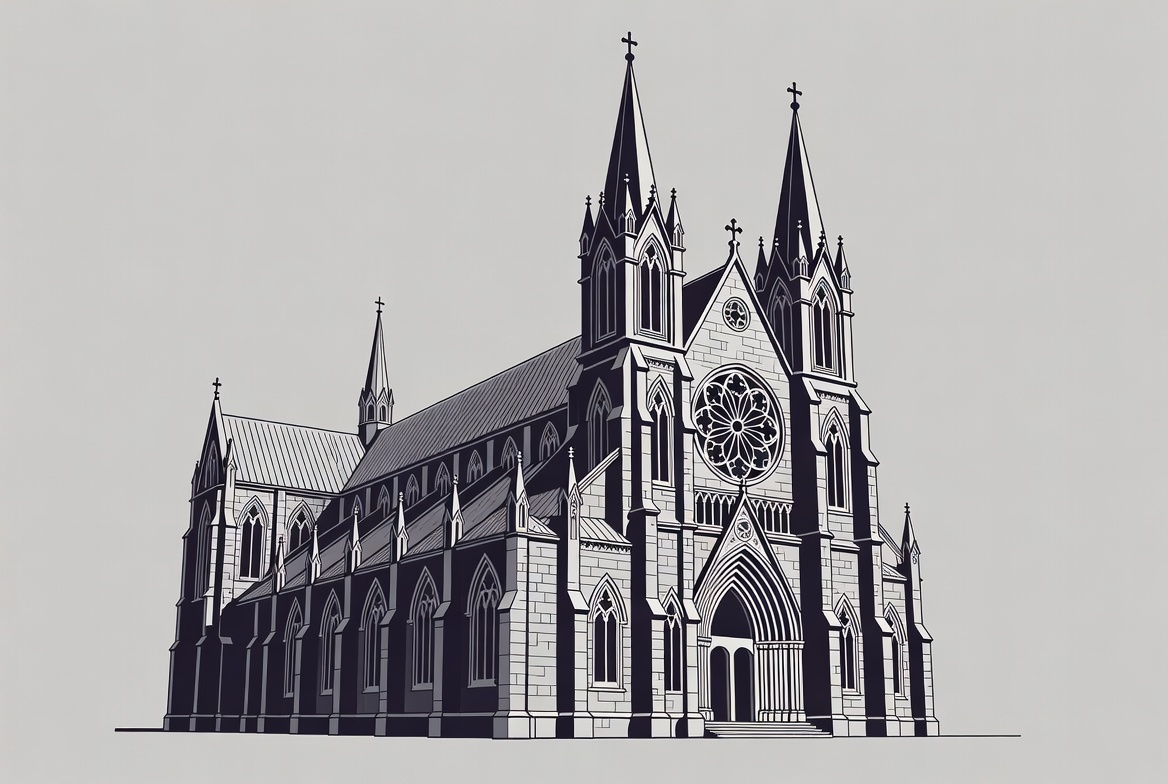Gothic architecture, arches, architecture, cathedral, church, detailed illustration, drawing, entrance, facade, gray background, historic church, illustration, isolated, line art, religious building, rose window, spires, stone building, tall towers, vector art, windows, Gothic cathedral