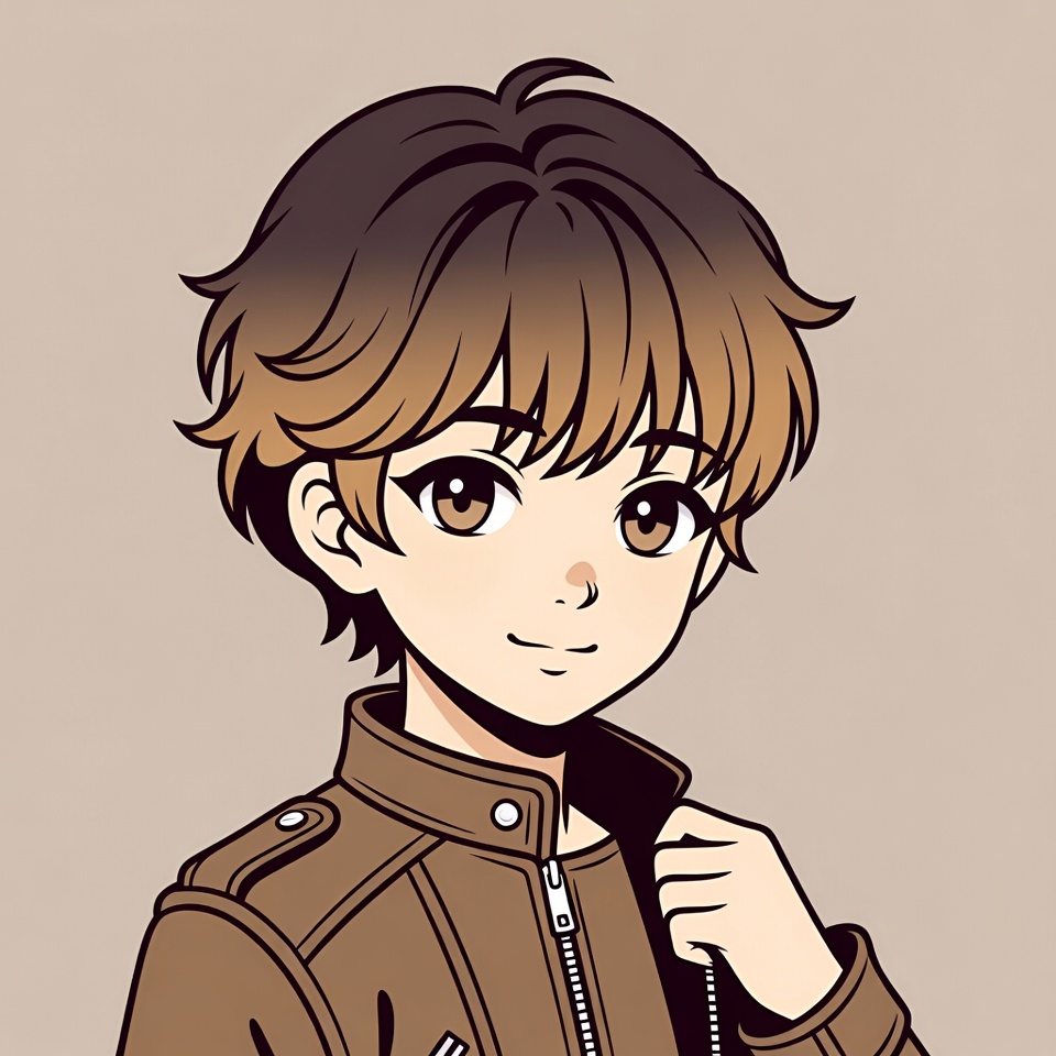 Asian, beige background, boy, brown hair, brown jacket, chibi style, cute, hand gesture, illustration, isolated background, large eyes, leather jacket, male, manga character, portrait, smiling, stylish jacket, wavy hair, young boy, anime boy