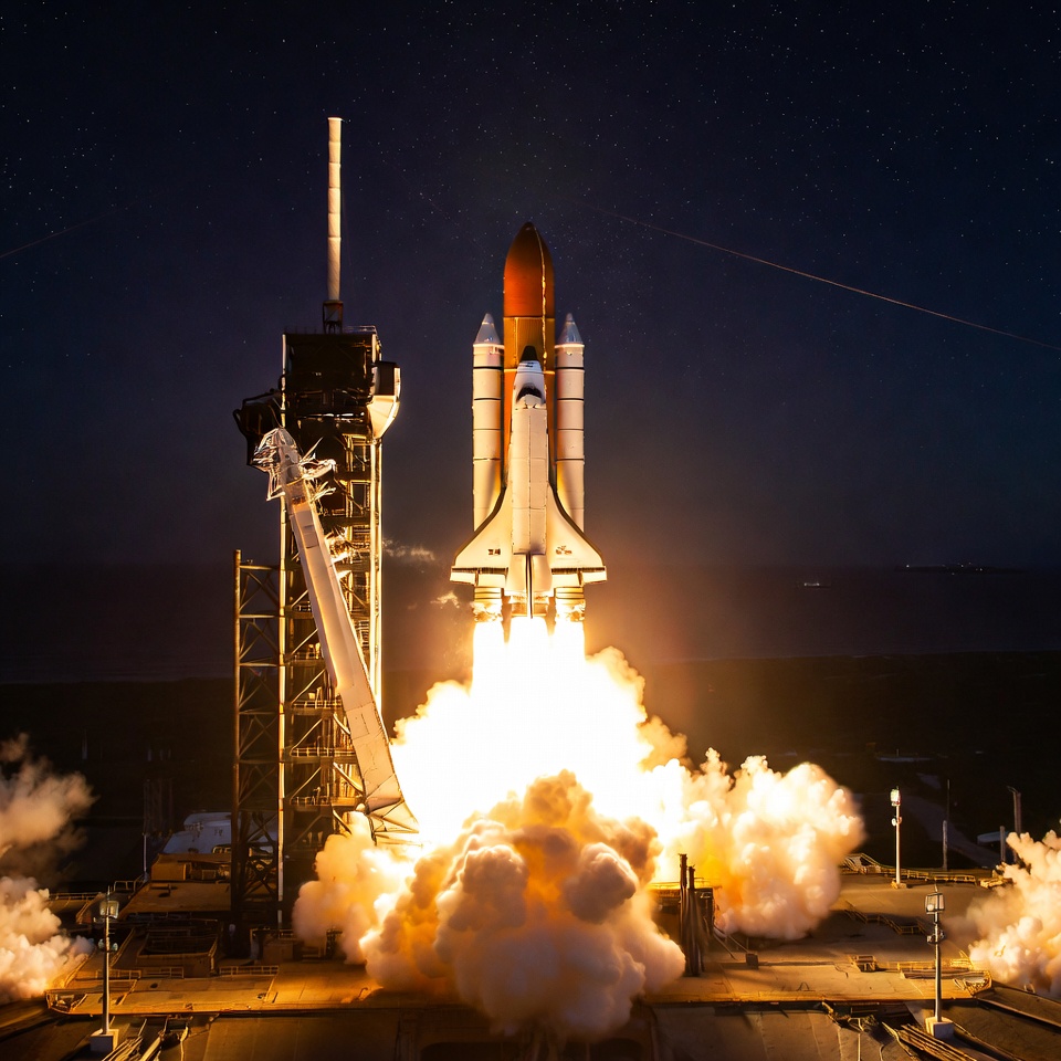 A Space Shuttle lifts off from its launch pad at night, surrounded by a towering gantry structure. Bright flames and thick smoke billow from the engines as it ascends into the starry sky. The scene is illuminated by the intense glow of the rocket exhaust.