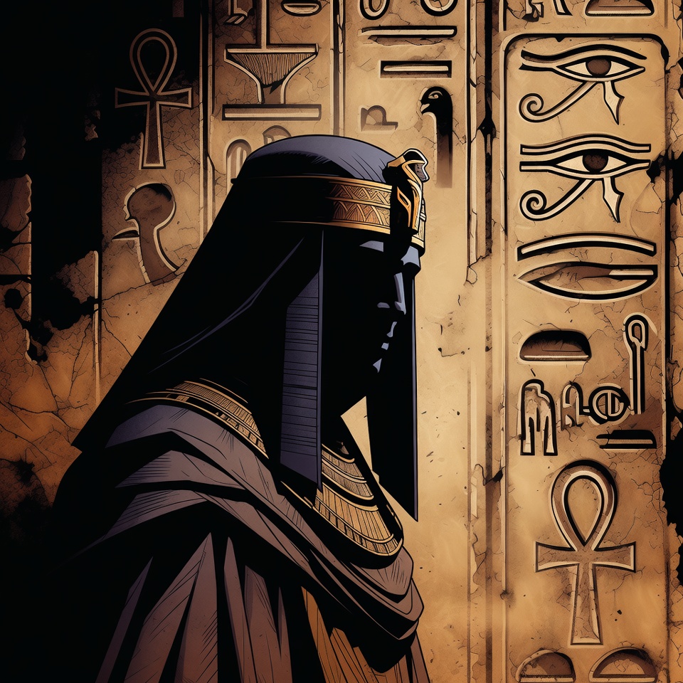 Egyptian, Eye of Horus, ancient Egypt, ankh, archaeology, carvings, cobra, comic art, dark skin, headdress, hieroglyphs, illustration, isolated background, king, mythology, nemes, profile view, robes, staff, stone wall, symbols, temple, uraeus, pharaoh