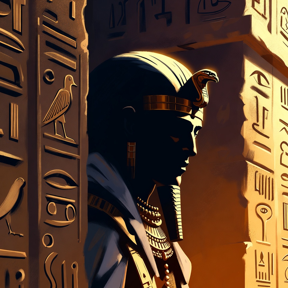 A silhouette illustration of an ancient Egyptian pharaoh in profile view stands against tall stone pillars engraved with hieroglyphs. He wears a golden headdress adorned with a cobra and falcon, along with ornate necklaces and a white garment. A bird symbol appears near the glowing yellow background.