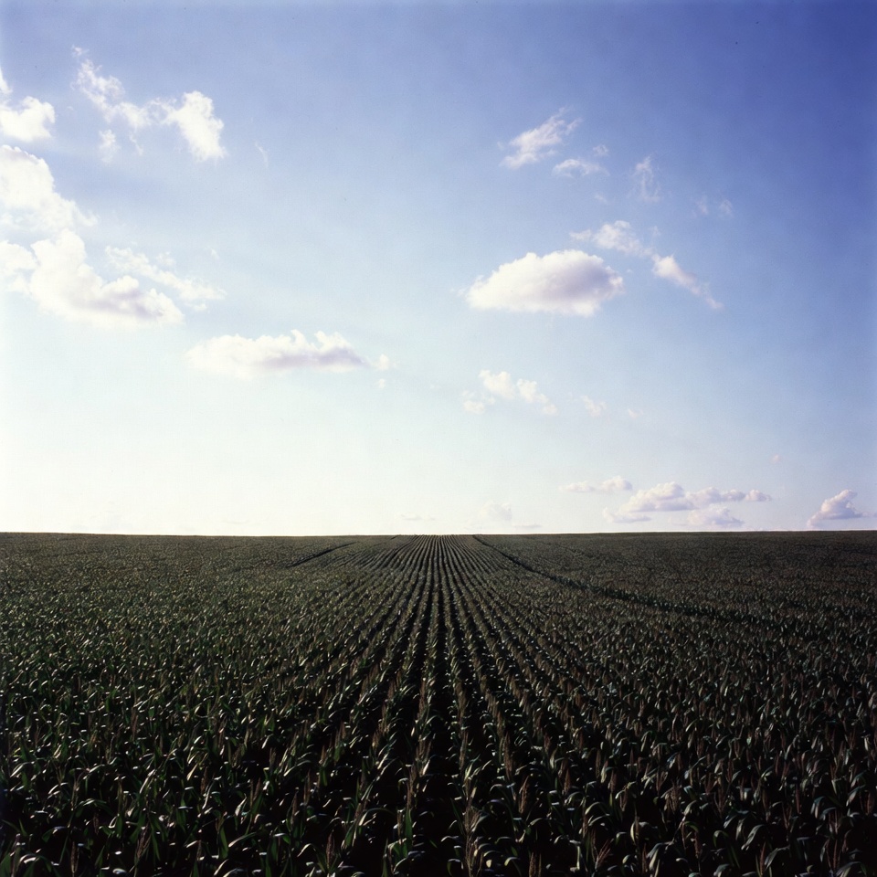 agriculture, blue sky, clouds, corn plants, corn rows, cornfield, countryside, crop rows, farming, farmland, fields, flat landscape, green corn, green crops, harvest, horizon, landscape, maize field, nature, outdoors, rural, sky, sunny day, vast field, white clouds, corn field
