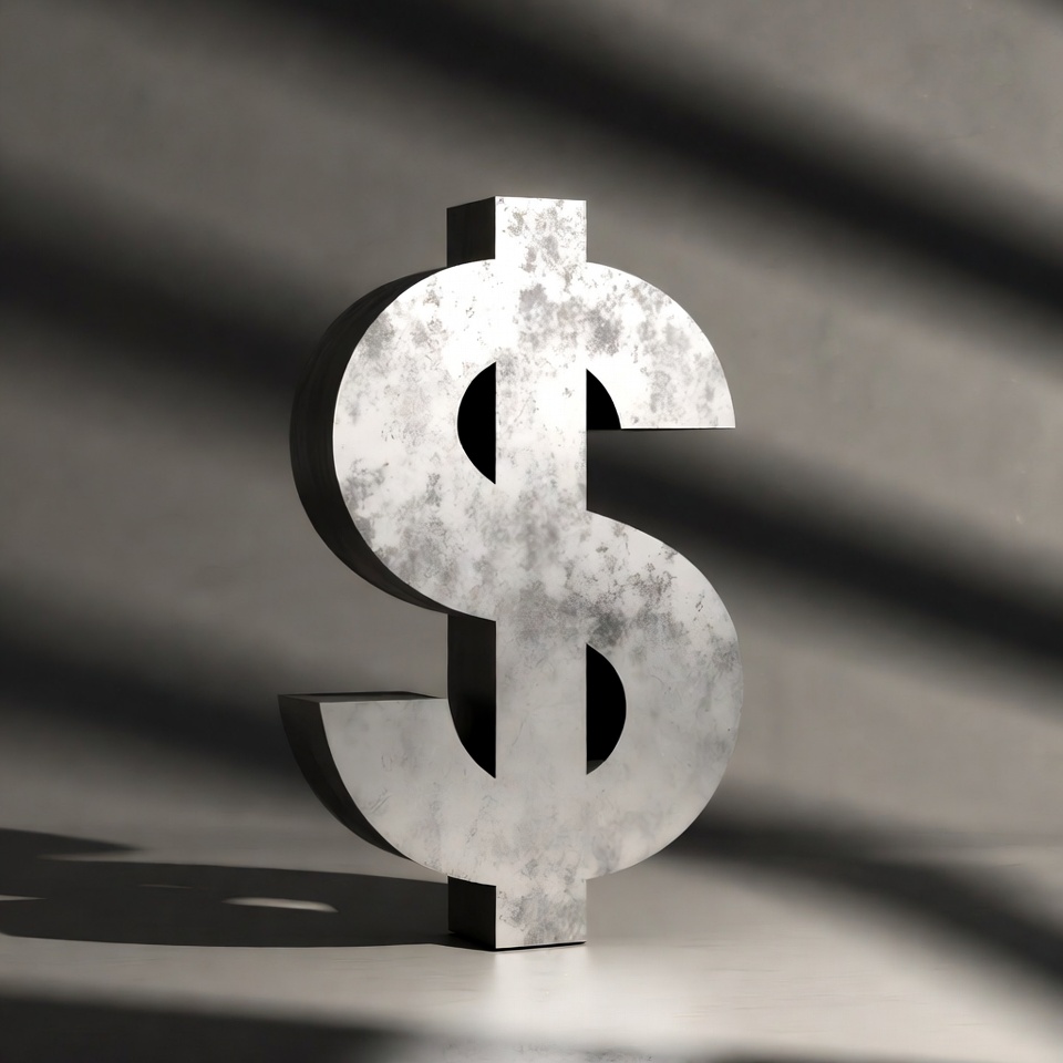 A large metallic dollar sign symbol stands on a gray surface with dramatic shadows. The surface has a rusty, weathered texture and subtle scratches. Soft lighting casts long shadows behind it on an isolated background.