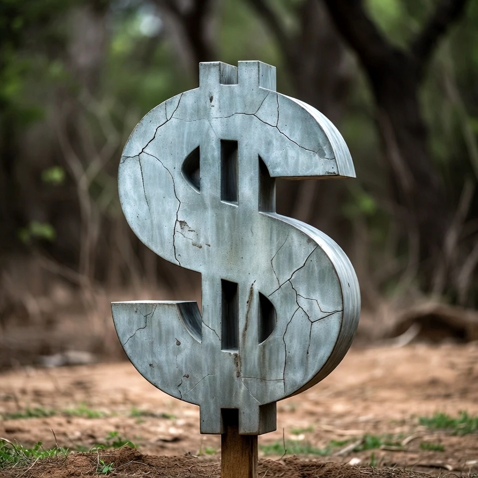 blurred greenery, cracked surface, currency icon, economic symbol, financial symbol, forest background, grass, gray metal, isolated object, large prop, metallic sculpture, money symbol, nature, outdoors, rusty metal, trees, weathered texture, wooden post, woods, dollar sign