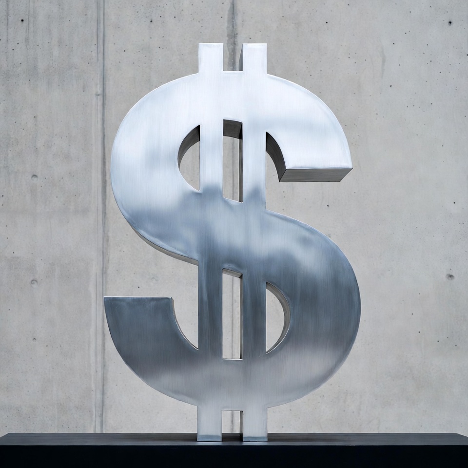 A large metallic silver dollar sign stands prominently on a black base. It is positioned against a textured gray concrete wall. The symbol features a bold, three-dimensional design with a reflective surface.