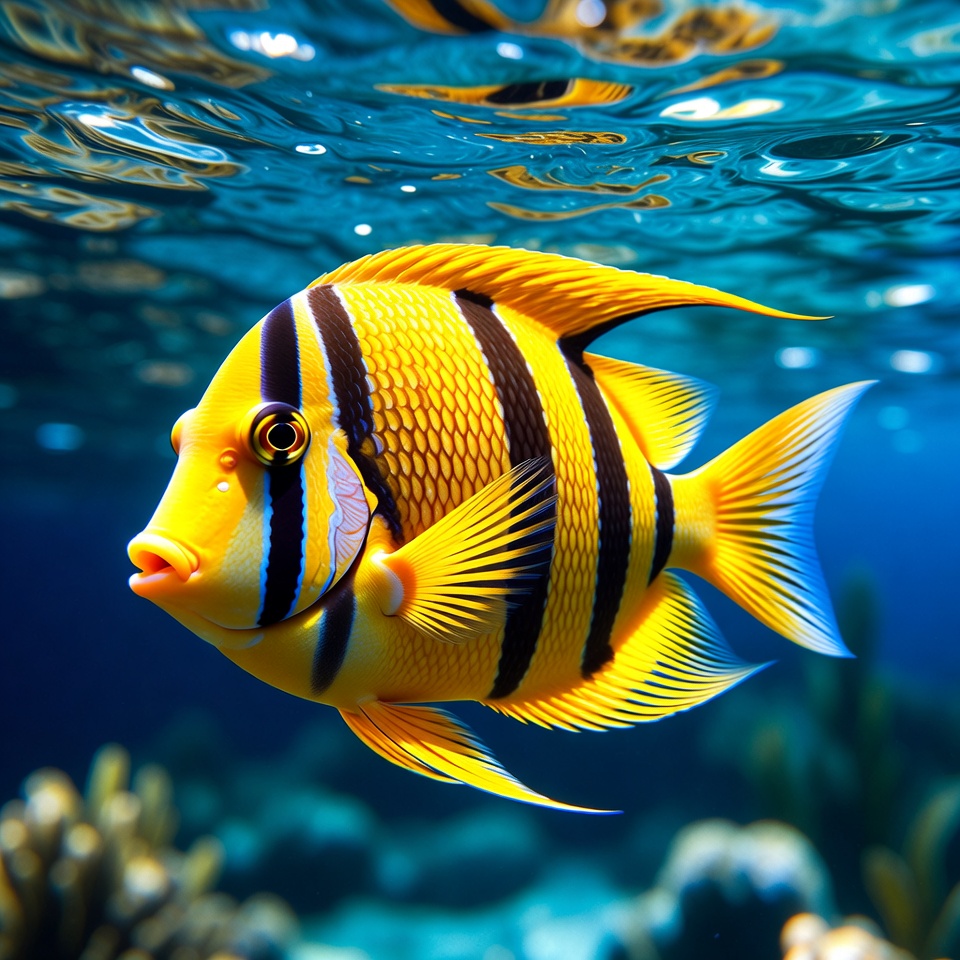 aquarium fish, aquatic, black stripes, blue water, coral background, coral reef, fish, marine life, ocean, ocean creature, sea animal, striped fish, swimming fish, tropical fish, underwater, vibrant colors, yellow fish, yellow tang