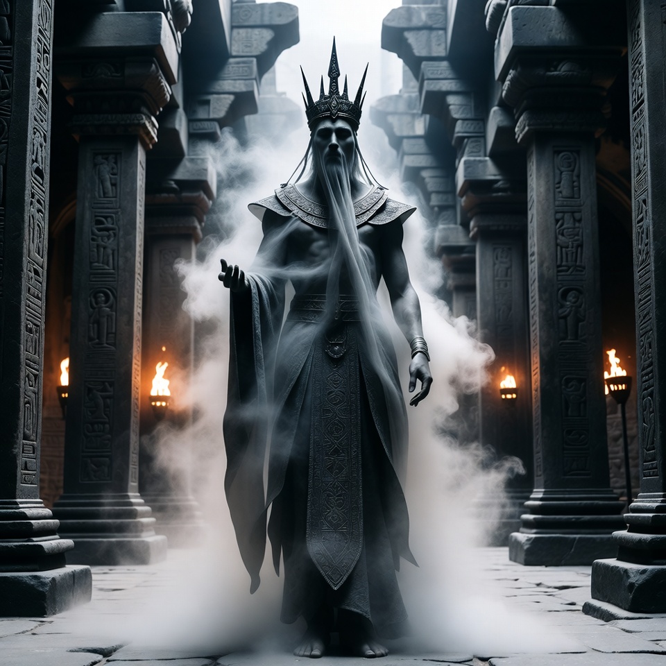 A tall wizard king with a long white beard and crown stands in a dark ancient temple with tall stone pillars. He wears flowing dark robes and holds a staff, surrounded by swirling mist and flickering torchlight on the ground. The scene features intricate carvings on the pillars and a foggy atmosphere.