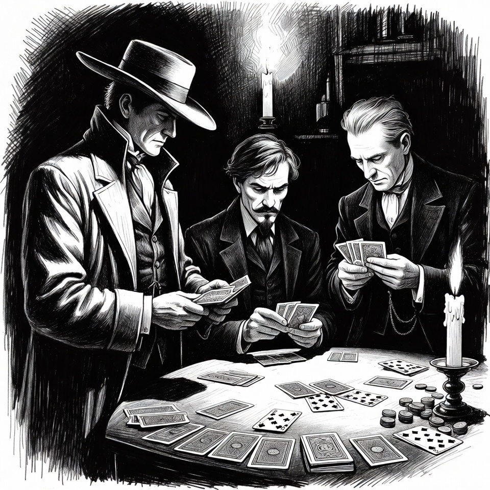 A black and white ink illustration depicts three men in Victorian attire seated around a table playing poker cards. One man wears a wide-brimmed hat and long coat, another has a mustache, and the third is clean-shaven, all holding cards intently. A candle provides dim lighting on the wooden table scattered with cards and poker chips.