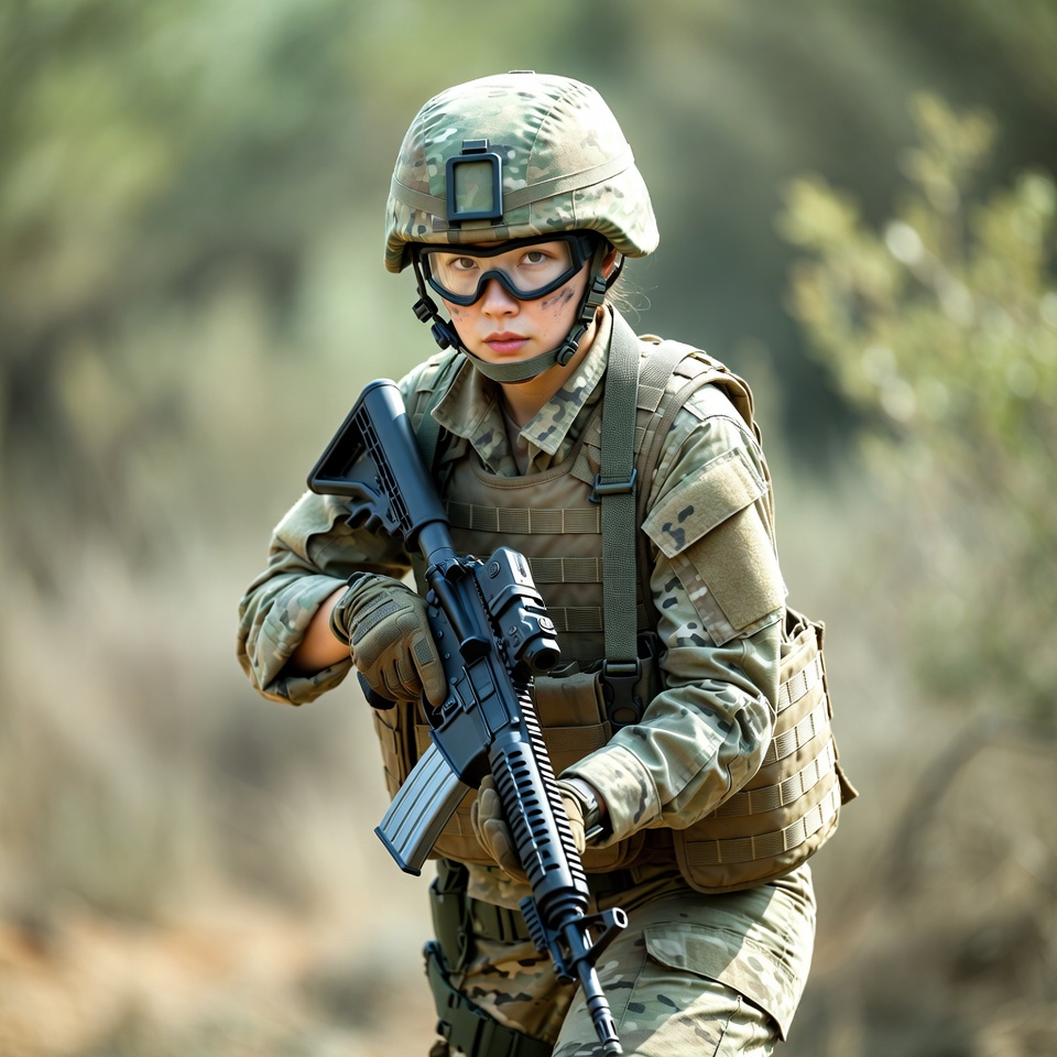 An Asian female soldier in camouflage uniform and helmet holds an M4 rifle ready in a green forest setting. She wears tactical goggles, body armor, and gloves while standing alert amid blurred foliage. Her expression is focused and determined.