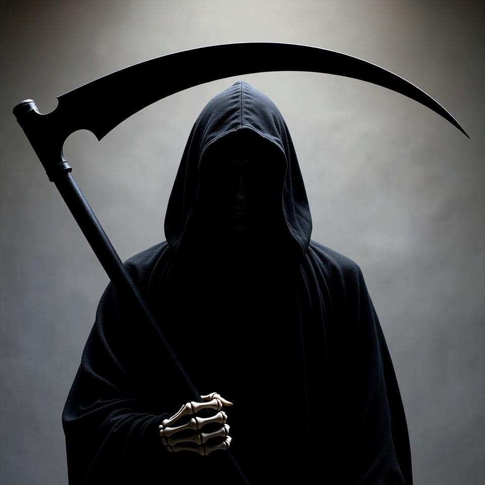 A cloaked Grim Reaper figure stands holding a large black scythe with bony hands. The figure wears a deep black hooded robe and cloak, with a shadowy face hidden beneath the hood. The image features a dark gray misty background for a dramatic effect.