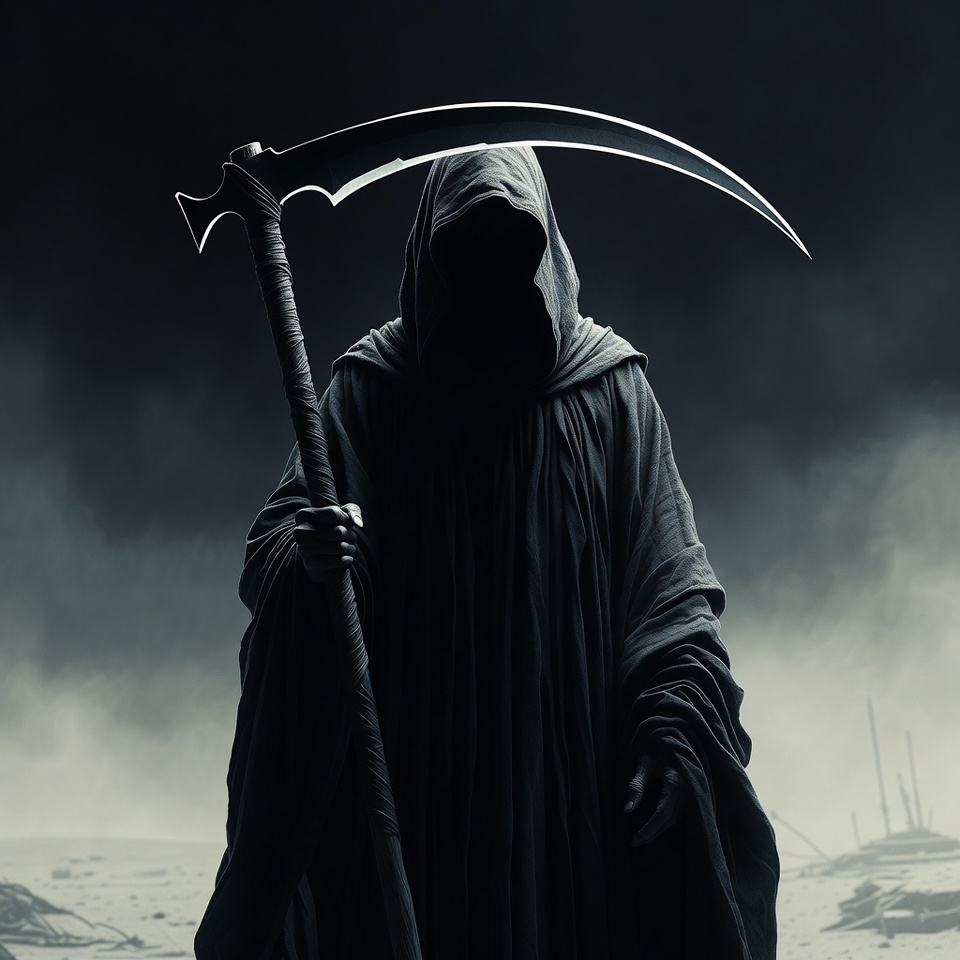 Halloween, black cloak, dark background, death, fog, grim reaper holding scythe, hooded figure, horror, illustration, isolated background, mist, ominous, scythe, skeleton, spooky, Grim Reaper