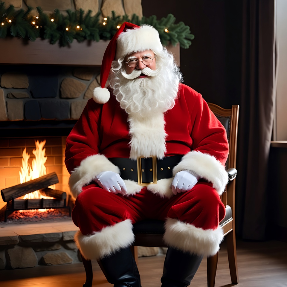 Christmas, Santa, White, black belt, black boots, fire, fireplace, fur trim, garlands, glasses, holiday, lights, logs, man, mustache, red suit, sitting, stone hearth, white beard, wooden chair, Santa Claus